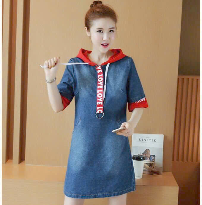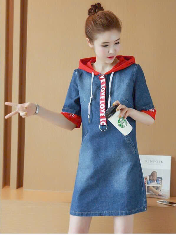 Đầm jean phối nón in chữ fashion D766 – thiết kế tay ngắn, điểm nhấn là phần phối nón in chữ nổi bật, không chỉ giúp người mặc thêm phần cuốn hút mà nón có thể bảo vệ làn da mỗi khi đi dưới trời nắng.